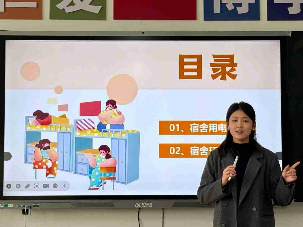 随后,尹老师对宿舍卫生和宿舍管理进行了重点阐述,通过展示正确与错误的宿舍卫生环境对比,让同学们直观地认识到良好卫生环境的重要性。同时,尹老师带领同学们重温了宿舍公约,使同学们清晰地了解了宿舍扣分规则以及如何保持干净整洁的寝室卫生。