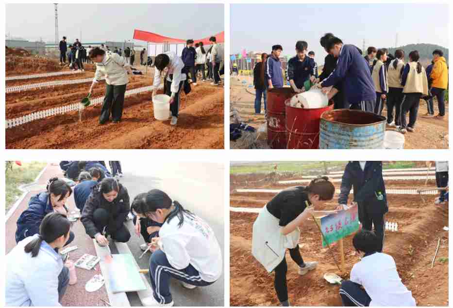 全体师生按照分组有序投入劳动。有的负责搭建分隔栅栏与外围环绕栅栏,有的在班主任带领下翻土、播种、浇水,有的往返运水保障田间用水;有的编出形态各异的稻草人,有的绘制创意十足的菜地班牌,有的精心编制竹门并安装基地门牌,为劳动基地增添一抹亮色。大家各司其职,现场一派繁忙。
