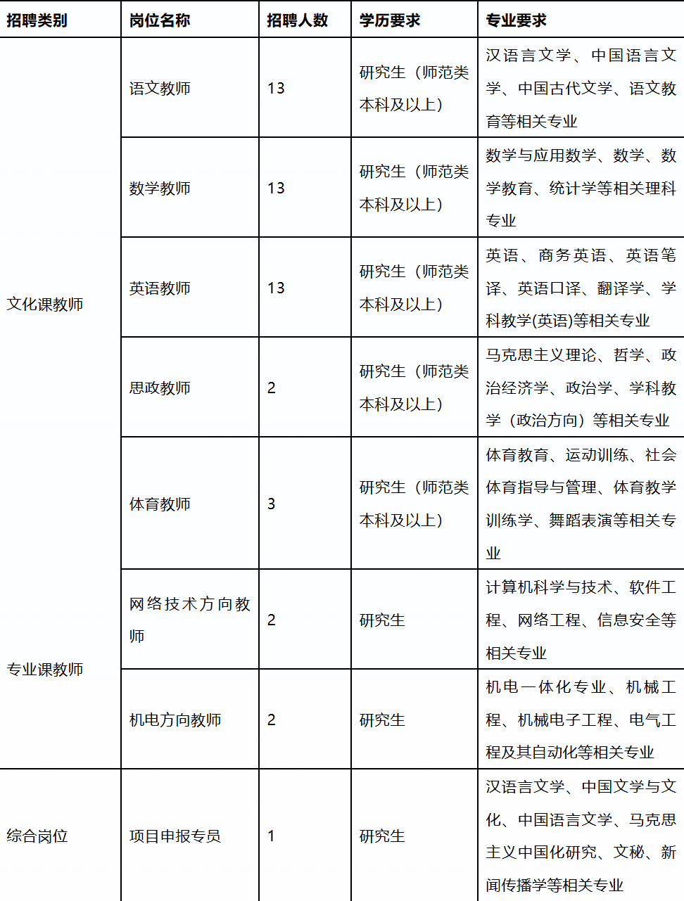 本次引进对象为2026届本科及以上学历应届毕业生。招聘岗位分为三类:A类:文化课教师岗位,B类:专业课教师岗位,C类:综合岗位